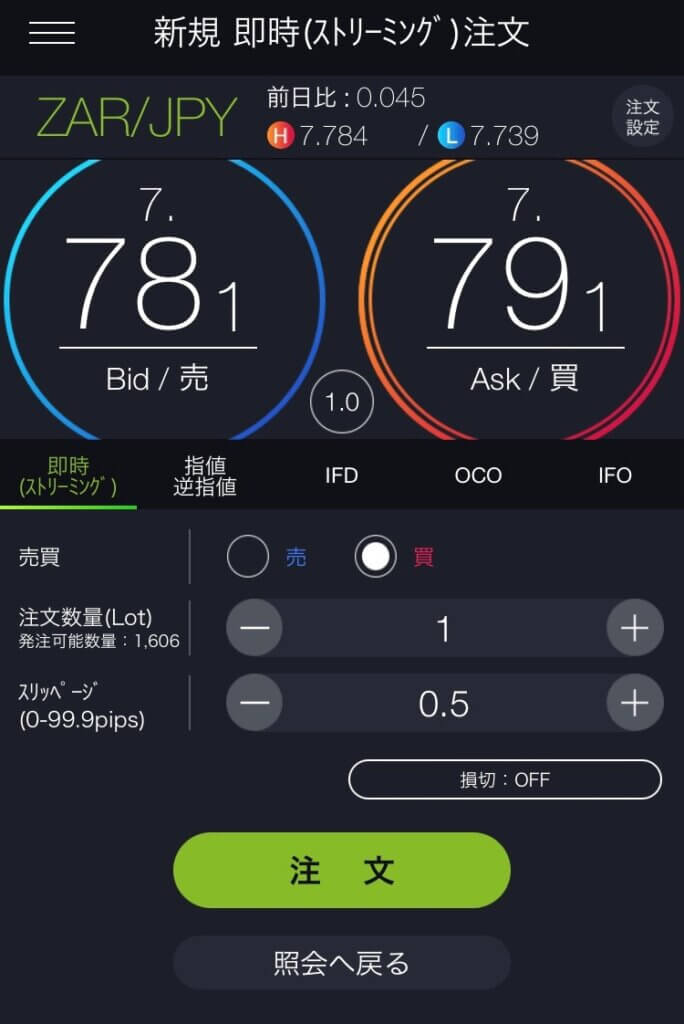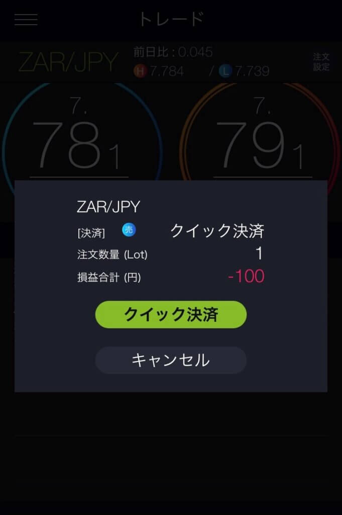③トレード画面で、通貨は南アフリカランド(ZAR)/日本(JPY)を選択します。